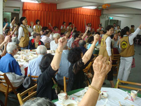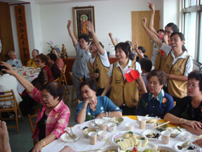 長者最喜歡的節目──「有獎徵答」;只要回答對就能得到獎品。你看,長者們多麼踴躍地舉手!