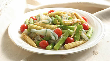 玉米筍1碗、蘆筍300公克(半台斤)、蒟蒻絲小卷1碗、 小番茄適量 |