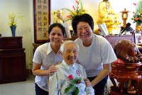 當初一聽到是要為長輩洗腳,並未有太大的新奇感,因為經常在家中與阿秀輪流為媽媽洗腳,但是透過這個活動,卻讓媽媽和我有了不同的體驗與感動。在家裡洗腳,洗得有些粗糙,有些馬虎;在道場,有慎重的儀式、周全的器具、體貼的準備與祥和的氣氛。這些都讓媽媽和我有著全新的感受。在司儀的引導下,緩緩為媽媽脫下鞋襪,慢慢為她洗腳、按摩,一直低著頭專心洗腳,一下子變得不知道該和媽媽說些什麼,聽到隔壁的月珠在和她媽媽聊天,於是也抬起頭看看媽媽,發現媽媽笑得好燦爛、好開懷,於是也對媽媽擠眉弄眼一番地逗逗她,媽媽耳朵很重,在家中都是用喊話的,在道場不好意思太大聲喊話,想一想還是回家再聊好了。