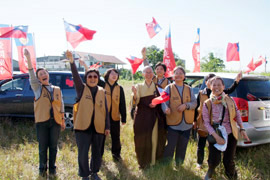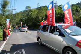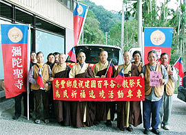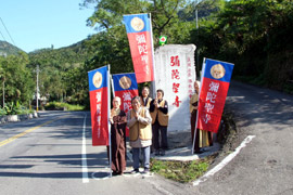 「花蓮各宗教祭天為民祈福」活動中,有一項是全縣花車繞境祈福,29日是壽豐鄉分配到的繞境日期,延續念佛法會的法喜,此日法師和義工們參與壽豐鄉繞境活動。上午8點不到,我們整裝出發前往鯉魚潭集合,三輛車插著「彌陀聖寺」紅藍相間的旗子,在青山翠谷間行駛,飄揚的旗子為靜謐的山區帶來另一種風味,是幡動、風動、還是心動?「壽豐」這個鄉鎮,民風純樸,人口不多,卻有著多種族群——閩南人、客家人、原住民、外省人……,一般人多數信仰道教,原住民則信仰天主教或道教,因此以道教的車隊居多;佛教只有彌陀聖寺和另一個寺廟,我們慶幸我們參加了,為佛教增添一份光彩。