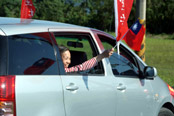 鄉民經濟能力有限,道教各宮的車隊無啥佈置,簡單地搬出他們的神明轎放在車上,或幾個年長的鄉民、或幾個年輕人、或幾個村婦全副農裝包頭包臉地敲鑼打鼓;相較之下,插著「彌陀聖寺」紅藍相間旗子的車隊,更顯得光鮮亮麗,與眾不同。將近百輛車的遊行隊伍浩浩蕩蕩綿延數公里,遠離前方鑼鼓喧天的道教隊伍,彌陀聖寺的三輛車在佛號聲中為隊伍壓軸。