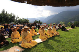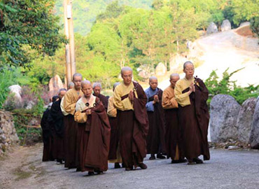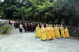 從涼爽的氣溫拜到豔陽高掛,是朝山很重要的一部份,這表示至少拜了一個小時以上;但這段山路,我們拜了兩個小時。雖然是時而上坡、時而下坡的山路,雖然人數眾多,但隊伍前進的速度不急不徐,大眾和合、莊嚴的唱誦,讓心裡升起妄念的速度漸漸變緩。我試著不生一念的走著、唱著、拜著,絲毫沒注意到已經過了那麼久的時間。九點多一點,隊伍終於抵達正法堂,大眾入殿,整個朝山儀式順利、圓滿。