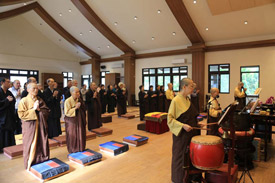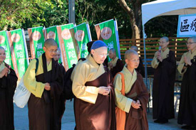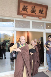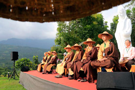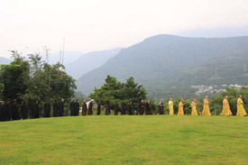 幾天前,法師們就開始率眾整理朝山的路徑。昨天下午法會結束後,大家再一次做了最後的整理工作,準備明天一早的朝山。我第一次參加朝山,是在美國聖城,從山門一路拜向大殿,然後開始浴佛大典;第二次朝山,是花蓮園區的觀音菩薩開光大典,從灰矇矇一片,偶有小毛雨飄落的天氣拜到豔陽高照、佛光四射的大晴天。今天,早上六點五十分,準備參加第三次朝山。