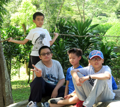 第二堂是讓孩子們蒙起眼睛,雙手搭在同學的肩膀,成一縱列,赤足行進,訓練信任感的建立與維護,同時體察赤足接觸大地,感受泥土、地形、小草與各種的落葉。然後每個孩子被個別帶到一顆樹前,讓其感受環境,之後團體集合,拿下眼罩,每人需找到自己的那棵樹。這是一個非常好的認知訓練,剛開始有些孩子因不習慣赤足或因調皮而哇哇大叫,慢慢的,大家開始專注自己的足下並體驗微風拂面與陽光灑在皮膚上的和煦。扎腳的時候,有的孩子口中呢喃「看破,放下」,有的孩子默默忍耐,漸漸的,整個隊伍安靜了下來,因為孩子們都享受於中。第三堂課是認識植物,要孩子們用眼睛看、用手去摸、用耳朵聽、用鼻子聞、用口來嚐、用心去體會。