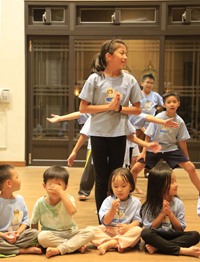 這次夏令營有兩場的話劇表演,第一場由所有的老師與家長擔綱演出,內容係依《弟子規》編排成五個生活短劇,但都是錯誤的示範,要請各隊自行討論並找出錯誤的地方。老師與家長生動活潑的演出,整場笑聲連連,但卻也發人省思。隔天由四個團隊抽籤表演類似的內容,要孩子構思如何在生活中落實《弟子規》;這是一個不容易的考驗,孩子們前一天晚上抽籤得知主題,旋即需設想劇情、角色扮演,而且必須全員參與,有的隊伍中三分之二的成員都是幼幼班,困難度更高。然而天下無難事,孩子們的創作與演練是令人驚豔的,他們的詮釋非常自然,演出投入,因為《弟子規》早已在他們心中扎根了。