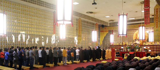 今天四面八方來的人,都到這兒祝賀觀音菩薩成道的紀念日。我們每一個參加這典禮的人,都應該迴光返照,問一問我自己什麼時候成道?什麼時候能具有和觀音菩薩一樣的大威神力?有感斯通,無求不應,能滿一切眾生的願。如果我們有這種力量了,也不可以自滿,也不可以存一個驕傲的心,還是要和眾生一樣,和光混俗,在世出世來教化眾生。不可以到處炫示自已有什麼功夫了,又有什麼境界了,又有什麼不可思議的神通智慧,變化無窮。這都是未證言證,未得謂得,可以說是打大妄語來欺騙眾生。這一點,修道的人切記切記不要犯這種錯誤,若犯了這種錯誤──打妄語,這是永遠要下地獄的,永遠沒有出頭露面的時候。