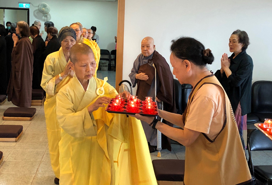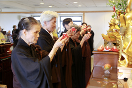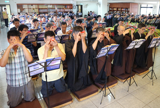 華嚴經共修的第三週,適逢五月十三日母親節,法師慈悲地讓與會大眾為父母在佛前點燈,一方面點亮自己的心燈,一方面期許大家效法上人,成為眾生修行路上的明燈。