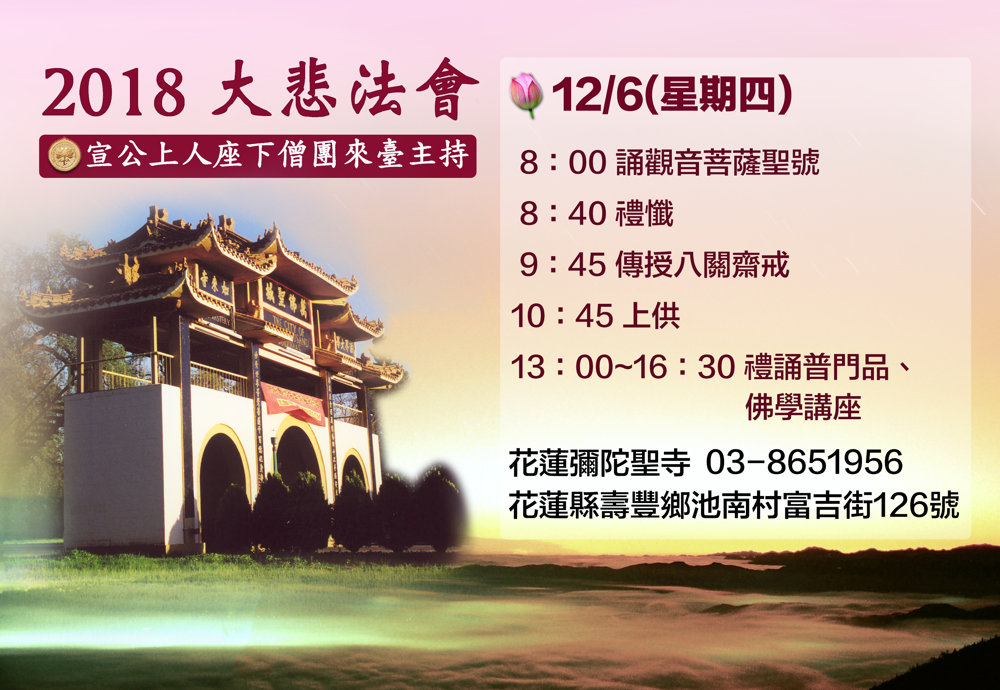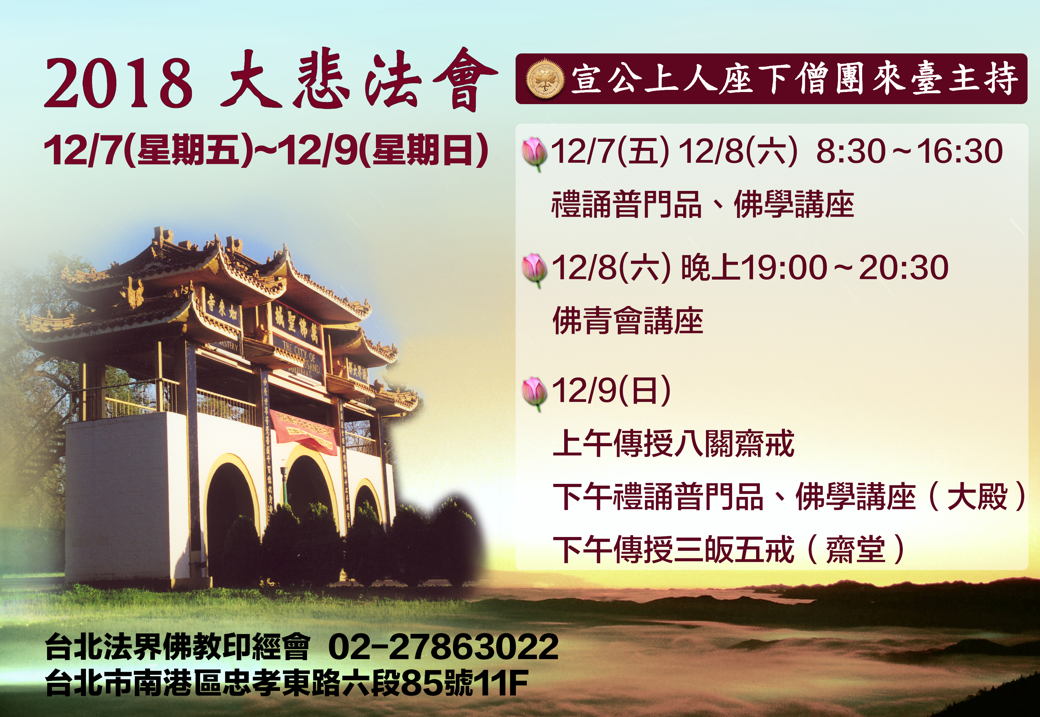 ◎日期:二○一八年十二月六日至十二月十三日 12月6日 彌陀聖寺(花蓮) 12月7日~9日 法界佛教印經會(臺北) 12月10日 法界聖寺中部分會(臺中) 12月11日~12日 法界聖寺(高雄六龜) 12月13日 高雄分會
