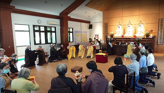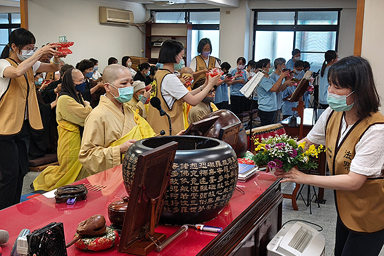 六月一日當天,臺北法界與彌陀聖寺皆舉行普佛、傳供儀式,場面莊嚴。傳供儀式自一九九五年上人圓寂後即成為紀念法會的重要儀軌,惟自二○二○年疫情以來多次中斷,去年始得恢復。今年因 上人涅槃三十週年,諸多弟子特地回道場參與。臺北法界義工組事前細心籌劃,安排充足人手與傳供路線,原擔心來參加者人數不多,未料法會當日信眾陸續湧現,傳供井然有序。很欣慰大家銘記著 宣公上人的教誨,齊聚道場,緬懷追思 上人慈悲莊嚴的德行。